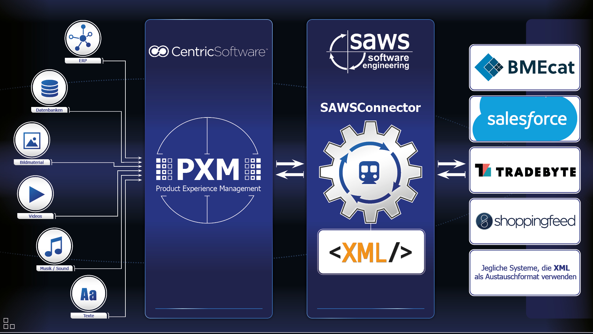 BMEcat, Salesforce, Tradebyte, Shoppingfeed und jedes andere System, das XML als ein Austauschformat verwendet.